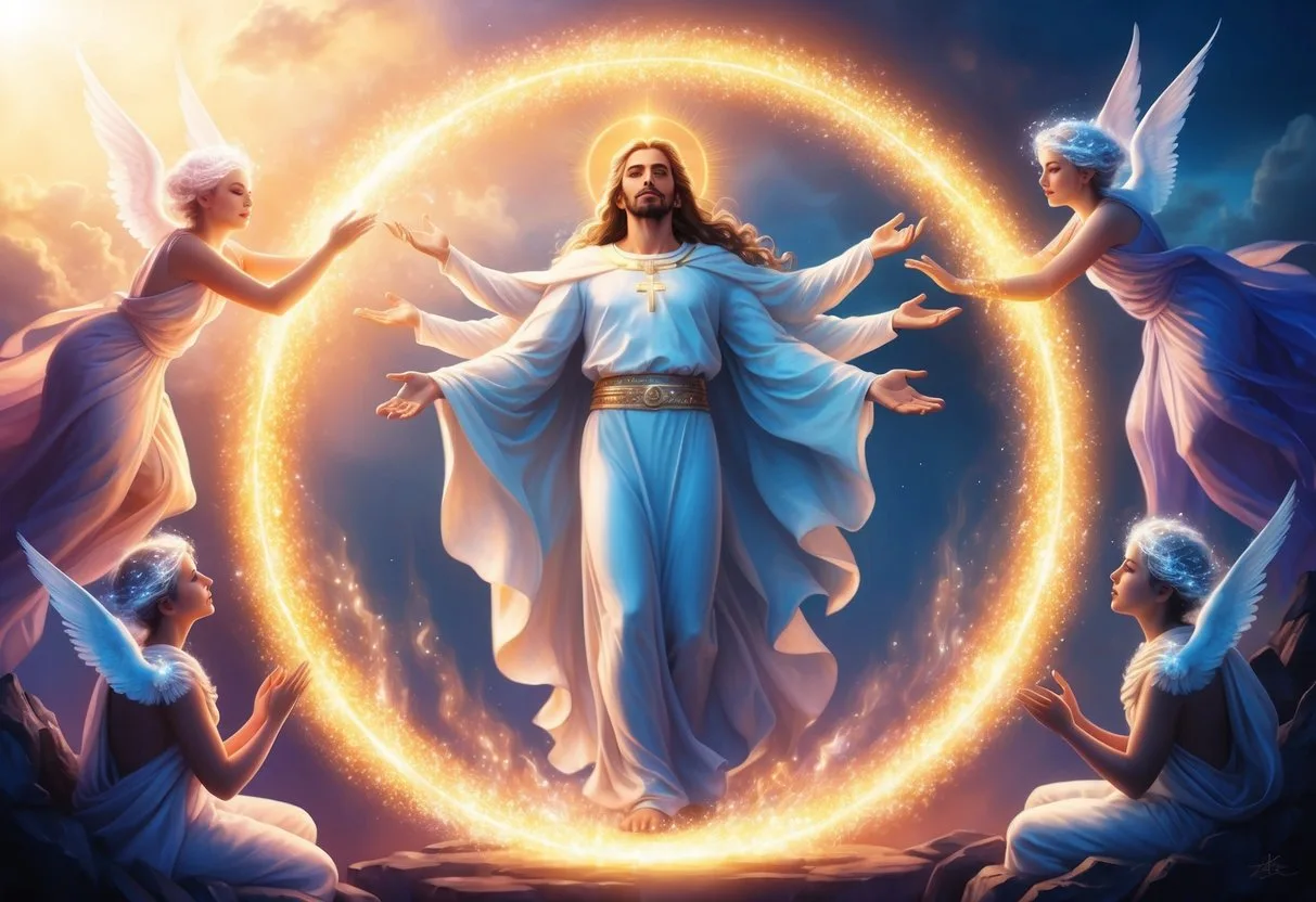 A serene figure surrounded by glowing light, basking in self-admiration and superiority
